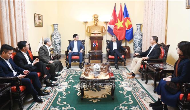 Đại sứ Việt Nam tại Cuba Lê Quang Long cập nhật tình hình địa bàn với Thứ trưởng Bộ Tư pháp Nguyễn Thanh Tịnh và đoàn.