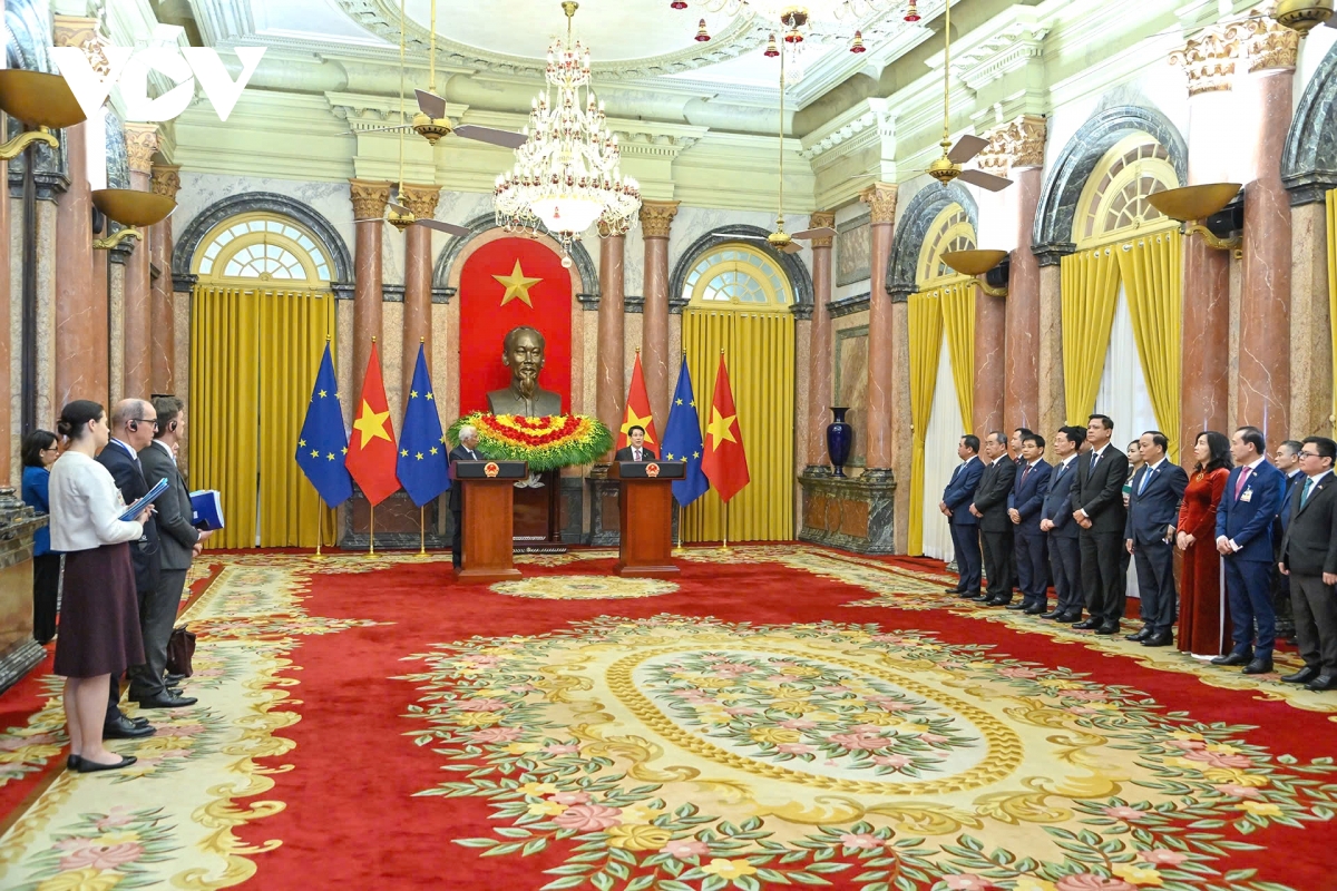Sau khi kết thúc hội đàm, ngày 29/1, Chủ tịch nước Lương Cường và Chủ tịch Hội đồng Châu Âu António Costa đã có cuộc gặp gỡ báo chí để thông tin về kết quả hội đàm.