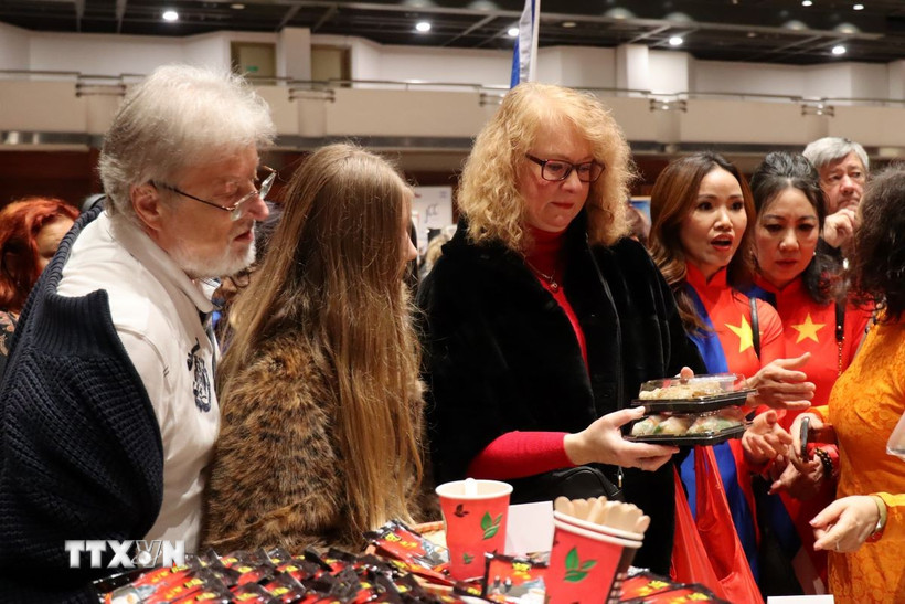 Khách hàng thích thú với các món ẩm thực tại gian hàng Việt Nam. (Ảnh: Việt Dũng/TTXVN)