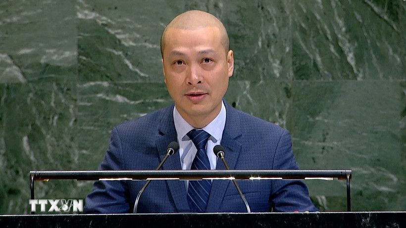 Công sứ Nguyễn Hoàng Nguyên, Đại biện lâm thời Phái đoàn thường trực Việt Nam tại Liên hợp quốc, phát biểu tại phiên thảo họp. (Ảnh: Thanh Tuấn/TTXVN)