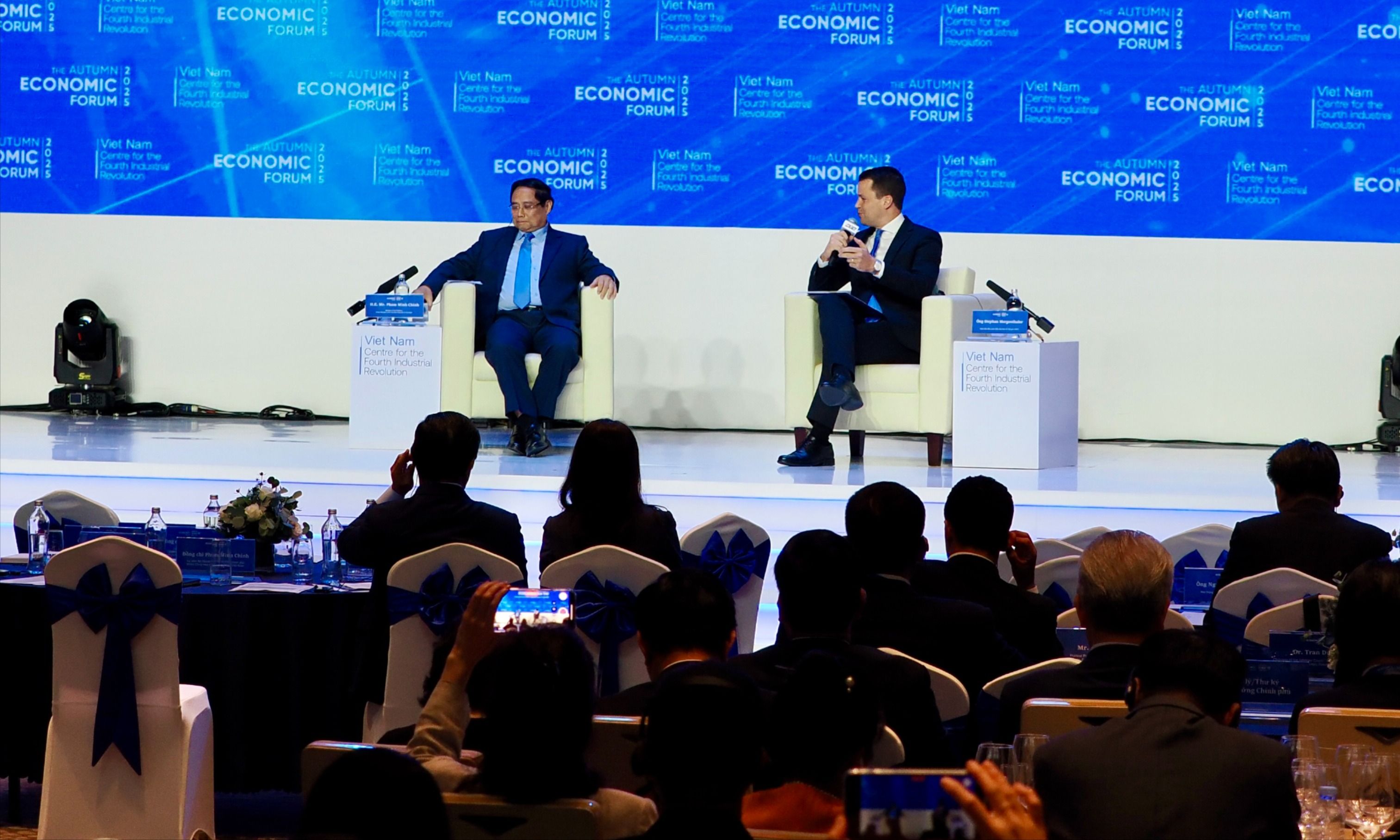 Thủ tướng Phạm Minh Chính đối thoại với Giám đốc điều hành Diễn đàn Kinh tế Thế giới Stephan Mergenthaler. Ảnh: HOÀNG HÙNG