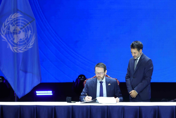 Đại sứ Anh tại Việt Nam Iain Frew ký Công ước Hà Nội. Ảnh: TTXVN