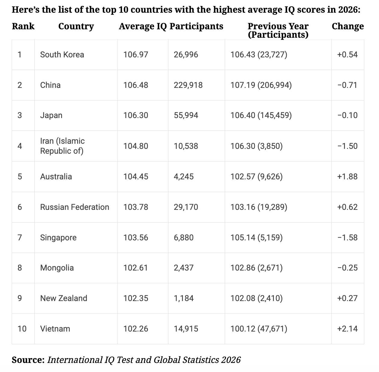 Danh sách 10 quốc gia có chỉ số IQ trung bình cao nhất vào năm 2026. Nguồn: International IQ Test and Global Statistics 2026