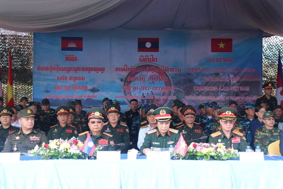 Sáng 15/10, tại Vientiane, đoàn đại biểu cấp cao Bộ Quốc phòng ba nước Việt Nam-Lào-Campuchia đã tham dự Diễn tập cứu hộ, cứu nạn chung giữa Quân đội ba nước.