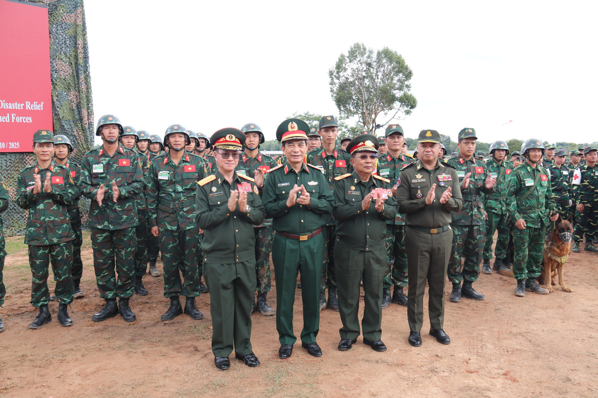 Đại tướng Chansamone Chanyalath, Đại tướng Phan Văn Giang cùng Bộ trưởng Quốc phòng hai nước Lào, Campuchia chúc mừng các chiến sĩ tham gia diễn tập.