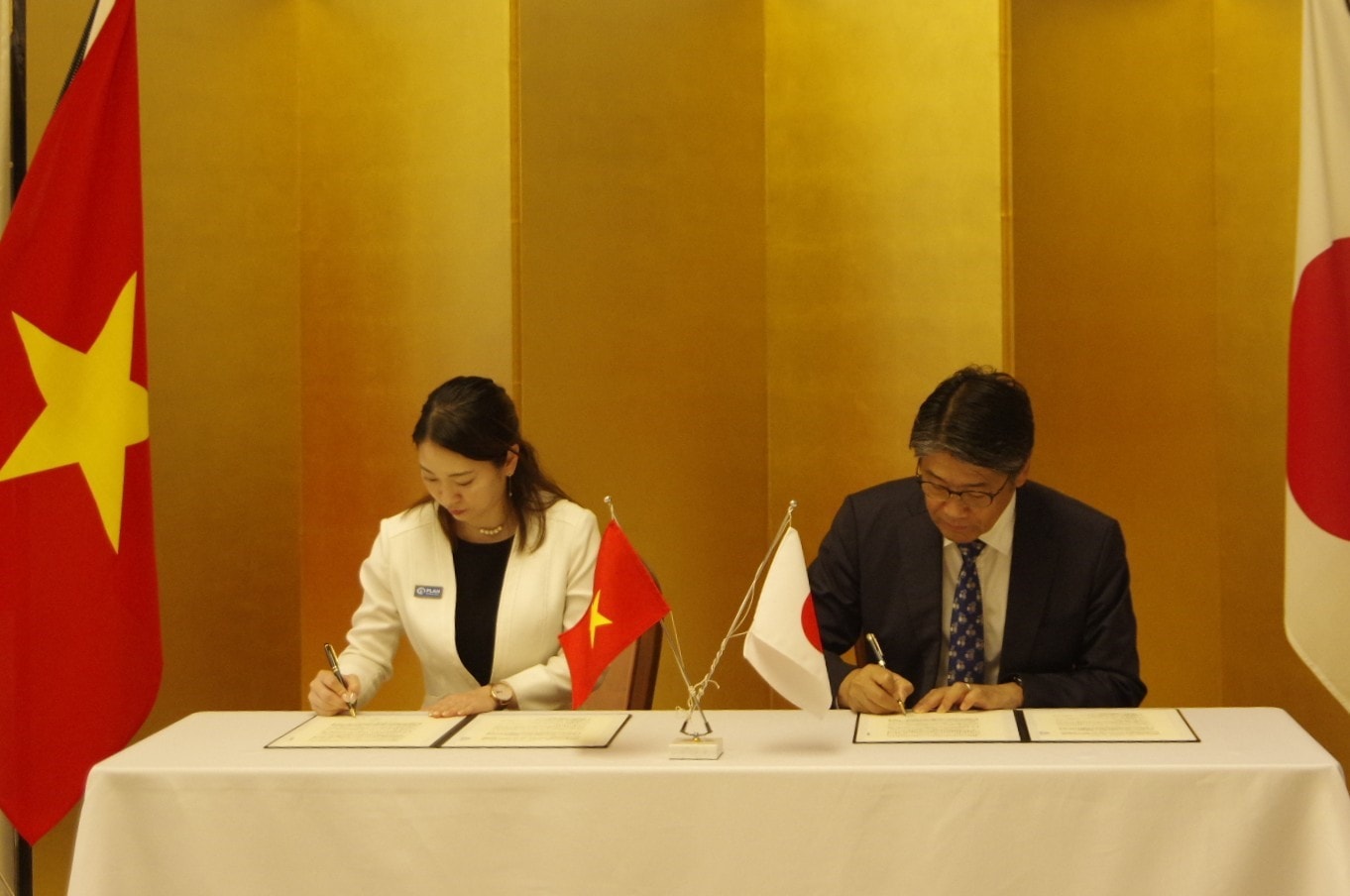 Đại sứ Đặc mệnh toàn quyền Nhật Bản tại Việt Nam Ito Naoki và Quản lý dự án của Tổ chức Plan International Japan, bà Mizukami Yurie đã cùng ký kết hợp đồng viện trợ.
