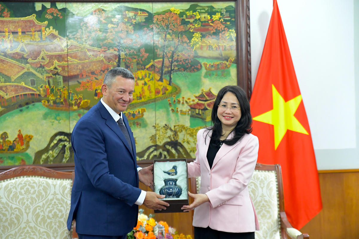 Bộ trưởng Bộ VHTTDL Lâm Thị Phương Thanh tặng quà lưu niệm cho Giám đốc Laurent Brunner.