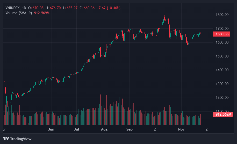 VN-Index vẫn chưa thoát khỏi xu hướng đi ngang. Ảnh: TradingView.