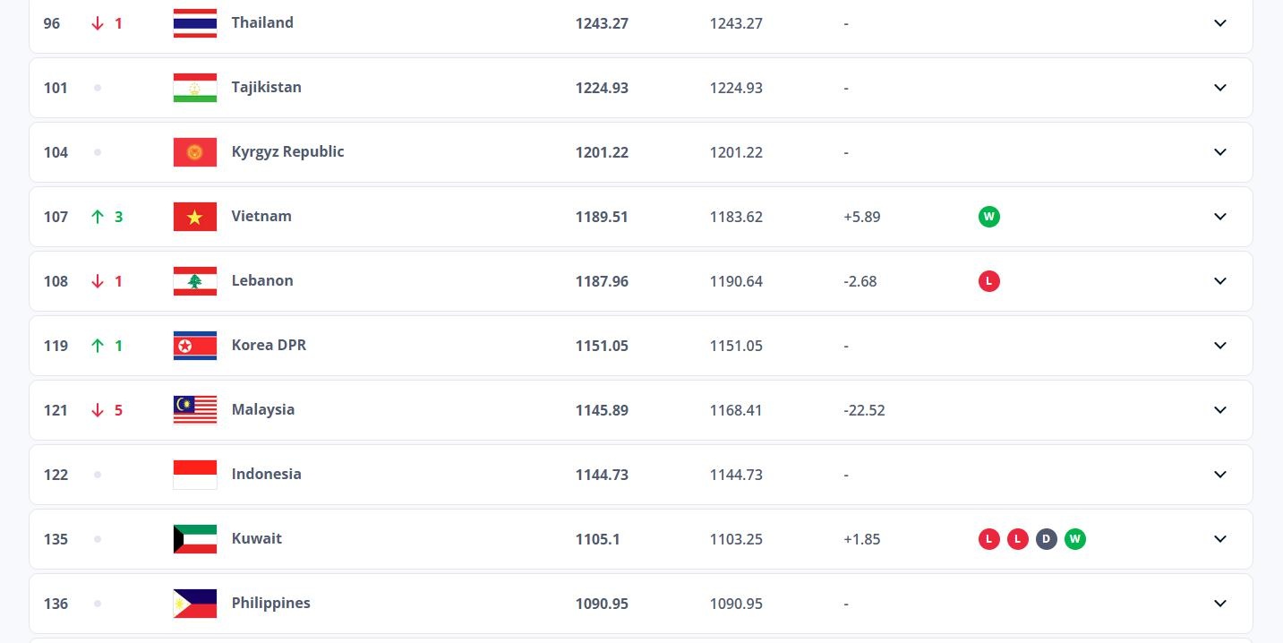 "Những chiến binh sao vàng" tiến sát top 100, trong khi Thái Lan giảm một bậc, xuống hạng 96. Trong bối cảnh khu vực châu Á có sự cạnh tranh ngày càng khốc liệt, việc thăng hạng đều đặn được xem là tín hiệu tích cực cho tham vọng dài hạn của bóng đá Việt Nam.