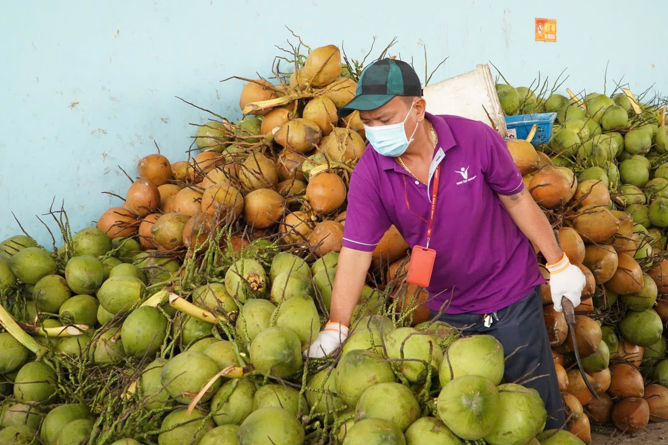 Nhân viên Vina T&T đang kiểm tra và chọn lựa những trái dừa xiêm xanh Bến Tre đạt chuẩn. Ảnh: Anh Nguyễn.