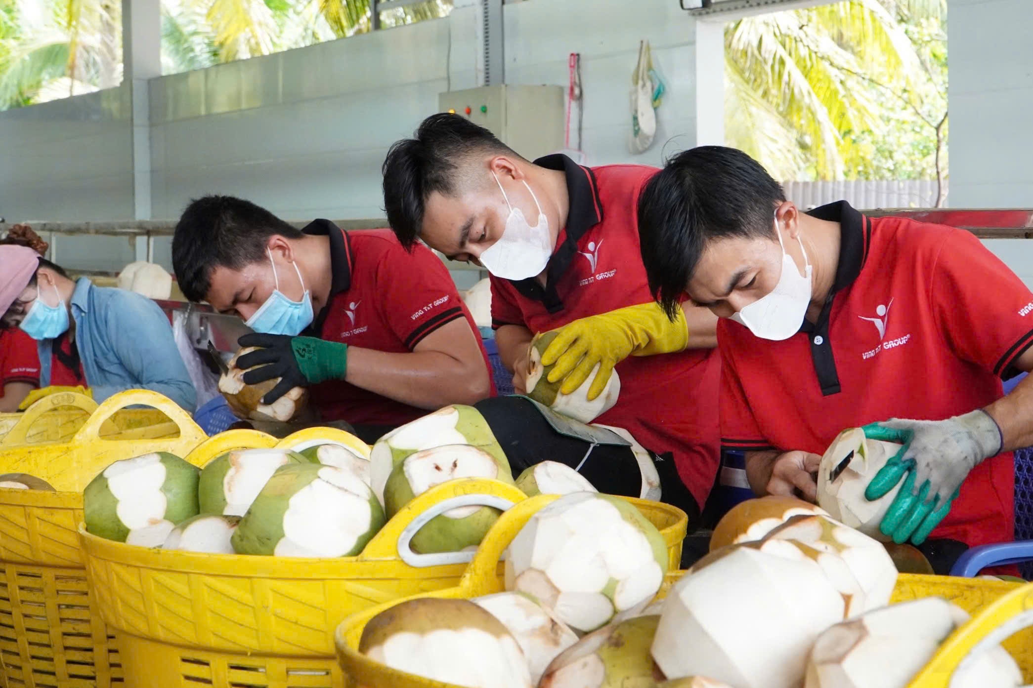 Công đoạn sơ chế dừa đạt chuẩn tại nhà máy Vina T&T. Ảnh: Anh Nguyễn.