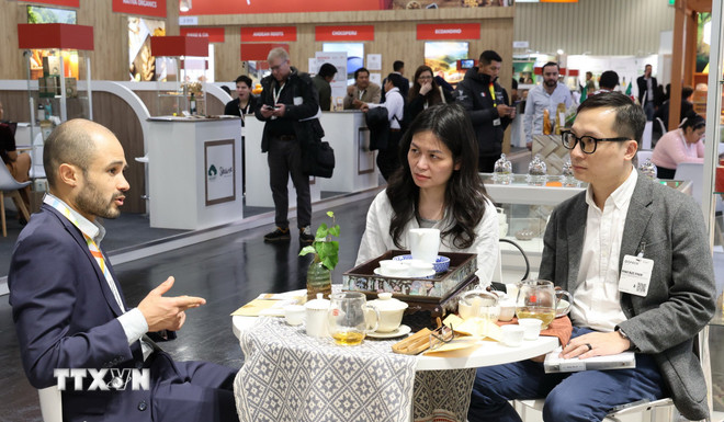 Tham tán Thương mại Đặng Thị Thanh Phương và ông Phạm Minh Đức, đại diện VOAA, trao đổi với ông Thomas Derstadt, Trưởng bộ phận thu mua mặt hàng gia vị của IPD. (Ảnh: Thu Hằng/TTXVN)