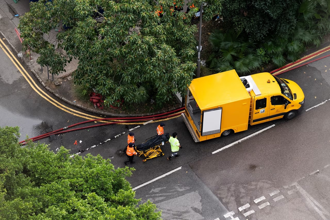 Xe cấp cứu đưa thi thể một nạn nhân ra khỏi đám cháy vào chiều 27-11. Ảnh: CNN