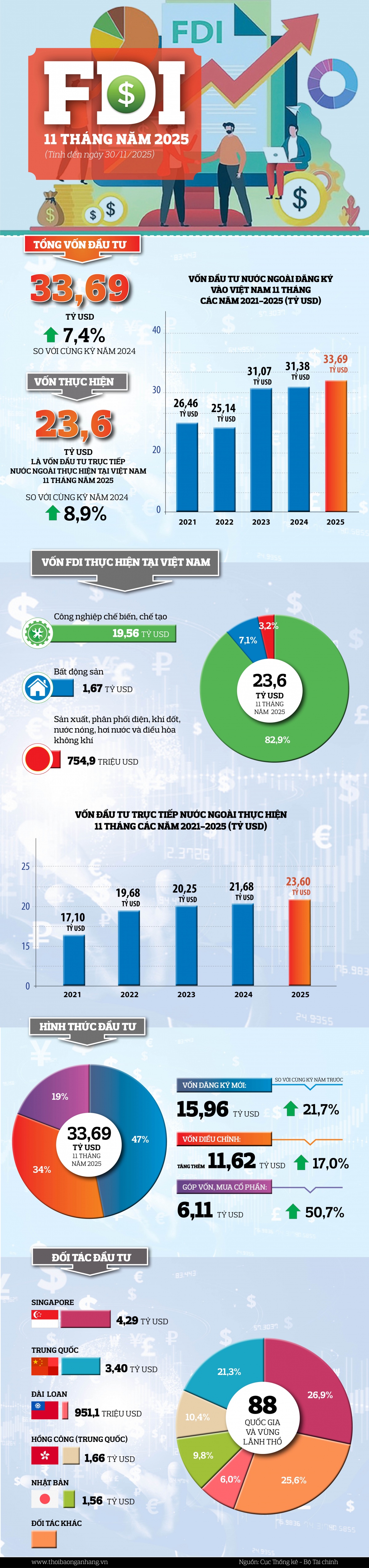 Việt Nam thu hút 33,69 tỷ USD FDI trong 11 tháng, tăng 7,4%