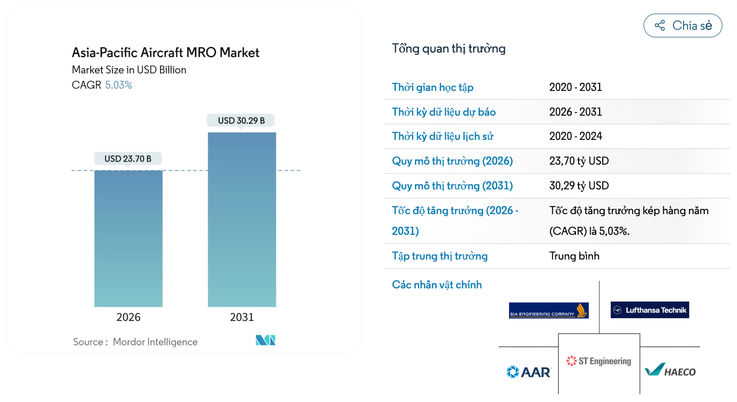 Theo báo cáo của Mordor Intelligence Thị trường bảo dưỡng, sửa chữa và đại tu máy bay (MRO) khu vực châu Á - Thái Bình Dương được định giá 23,70 tỷ USD vào năm 2026 và dự kiến sẽ đạt 30,29 tỷ USD vào năm 2031 với tốc độ tăng trưởng kép hàng năm (CAGR) là 5,03%. Trung Quốc thống trị thị trường bảo dưỡng và sửa chữa máy bay (MRO) khu vực châu Á - Thái Bình Dương với thị phần 33,51% vào năm 2025, trong khi Ấn Độ là thị trường tăng trưởng nhanh nhất, với tốc độ tăng trưởng kép hàng năm (CAGR) dự kiến là 7,9%.