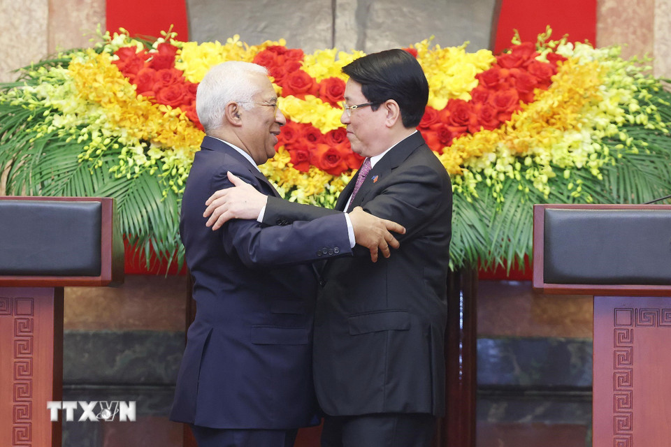 Chủ tịch nước Lương Cường và Chủ tịch Hội đồng châu Âu Antonio Costa sau gặp gỡ báo chí. (Ảnh: Lâm Khánh/TTXVN)