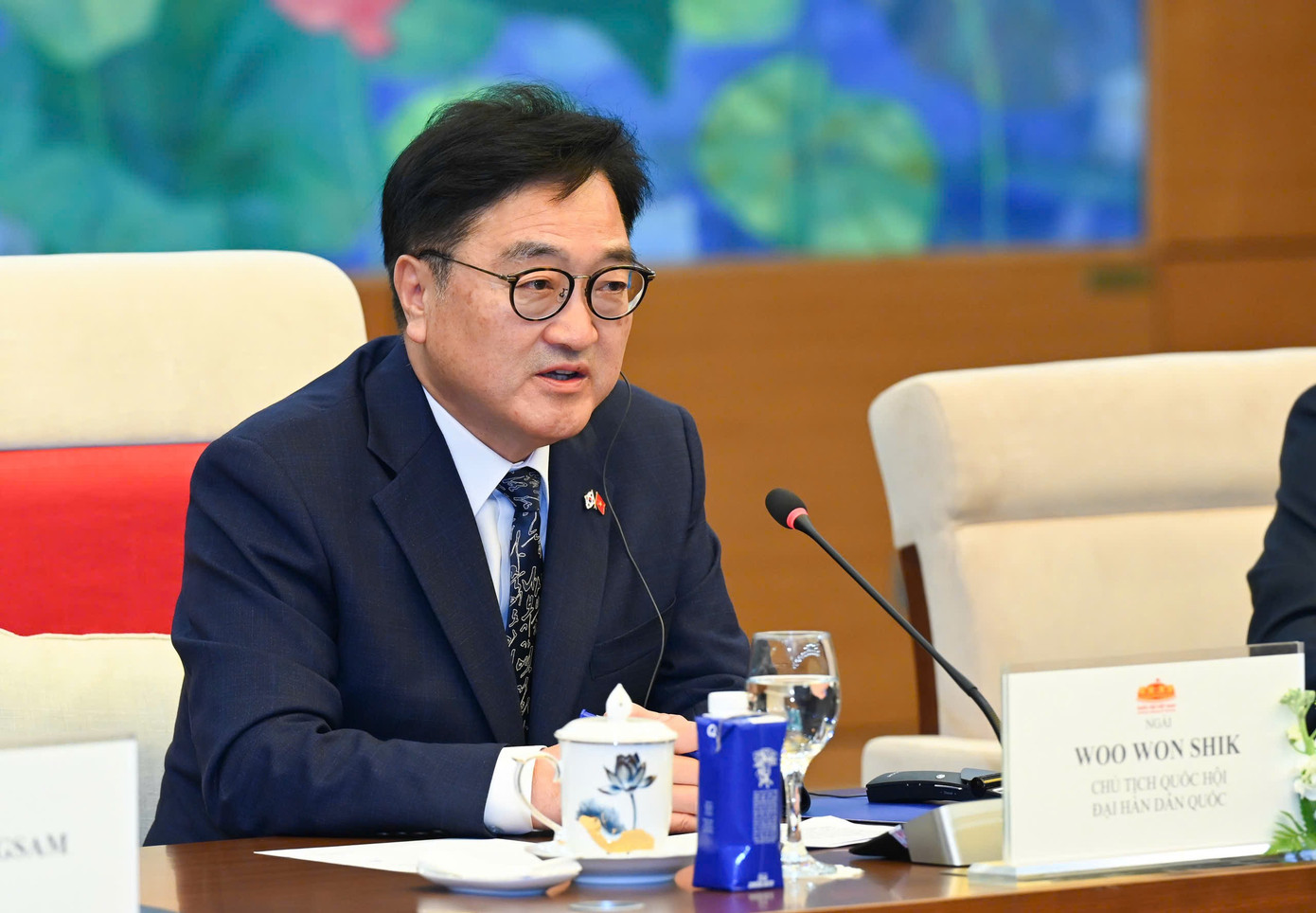 Chủ tịch Quốc hội Woo Won Shik nhấn mạnh Hàn Quốc tiếp tục duy trì vị trí thứ nhất về đầu tư trực tiếp, thứ ba về thương mại của Việt Nam và hai bên đã đạt mốc 5 triệu lượt người thăm nhau trong năm 2024; cho rằng hai bên có nhiều điểm tương đồng về văn hóa, trở thành đối tác kinh tế hàng đầu của nhau và có mối quan hệ không thể tách rời.