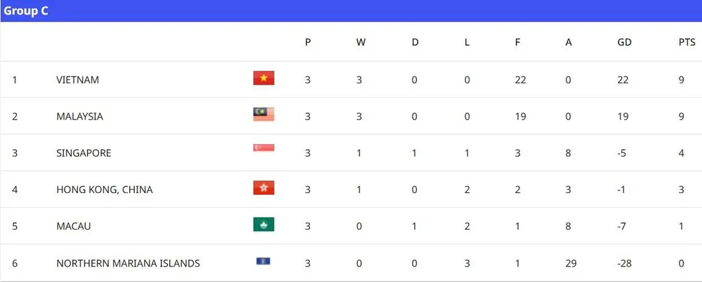 Bảng C có 6 đội thì Việt Nam và Malaysia tỏ ra vượt trội các đối thủ cùng bảng như Singapore, Macau, Hong Kong, Quần đảo Bắc Mariana.