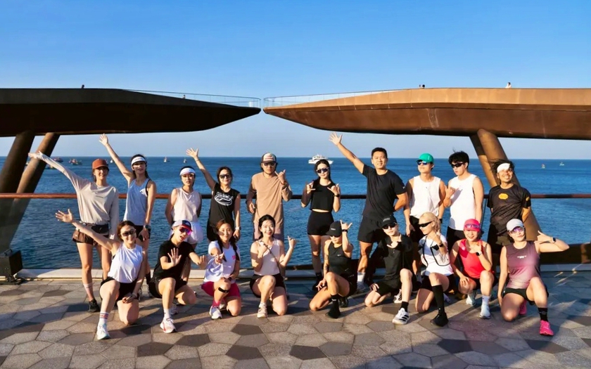Các runner (người tham gia chạy bộ) Hàn Quốc chụp ảnh kỷ niệm tại cầu Hôn ở Phú Quốc. Ảnh: Sun group