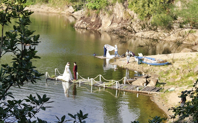 Hồ Xanh (hồ Bãi Bụt) nằm trên tuyến đường chính dẫn đến bán đảo Sơn Trà của Đà Nẵng, rất hấp dẫn du khách bởi vẻ đẹp tự nhiên hoang sơ và không khí trong lành. Hồ là nơi tuyệt vời để chụp ảnh đám cưới. Ảnh: hitchbird