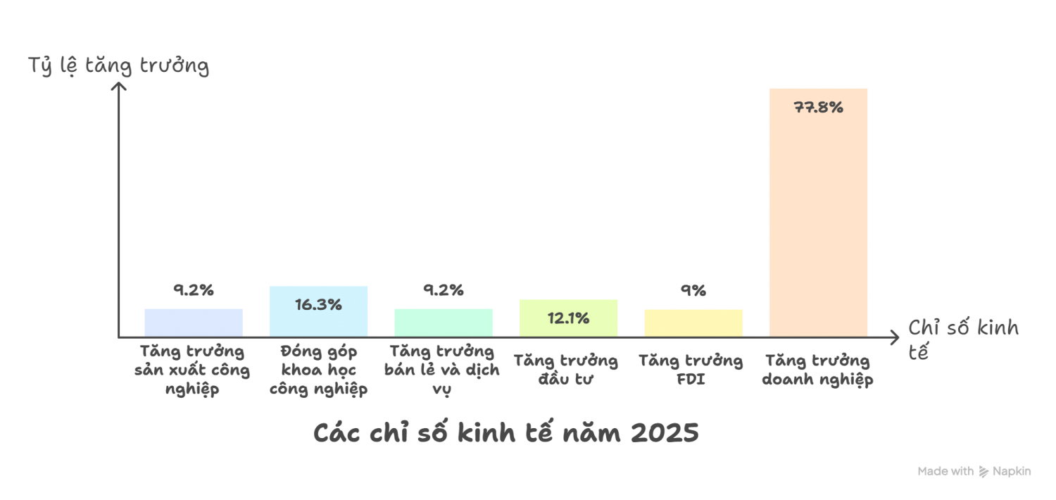Khoa học, công nghệ và đổi mới sáng tạo tiếp tục đóng vai trò ngày càng rõ nét trong tăng trưởng. Năm 2025, các hoạt động khoa học công nghiệp đóng góp trực tiếp khoảng 1,68% GDP và gián tiếp khoảng 0,81%, nâng tổng đóng góp lên gần 2,5% GDP, tương đương 320,4 nghìn tỷ đồng. Con số này tăng 16,3% so với năm 2024 và cao hơn khoảng 51% so với năm 2020. Trên bình diện quốc tế, Việt Nam xếp hạng 44/139 quốc gia và nền kinh tế về Chỉ số đổi mới sáng tạo toàn cầu (GII) 2025, đứng thứ 3 ASEAN, sau Singapore và Malaysia. Tuy nhiên, tỷ lệ doanh nghiệp thực hiện đổi mới sáng tạo đạt 34,6%, giảm 4,2 điểm phần trăm so với năm trước, cho thấy dư địa cải thiện còn lớn.