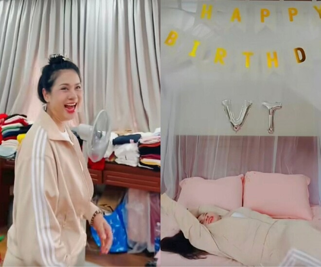 Nữ diễn viên Việt Trinh vừa chia sẻ khoảnh khắc xúc động khi được con trai Thiện Nhân và gia đình bí mật tổ chức sinh nhật. Trong đoạn video đăng tải, phòng ngủ của cô được trang trí với bóng bay và dòng chữ "Happy birthday", một món quà bất ngờ từ cậu con trai 16 tuổi.