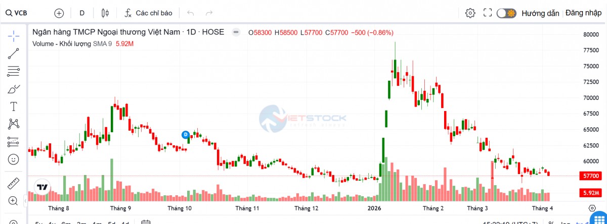 Trên thị trường chứng khoán, trong phiên giao dịch ngày 3/4, cổ phiếu VCB đóng cửa tại 57.700 đồng, giảm 500 đồng (giảm 0,86%) so với phiên trước đó, qua đó nối dài nhịp điều chỉnh sau khi đã giảm mạnh 1,36% ở phiên 2/4. Khối lượng giao dịch đạt gần 5,92 triệu cổ phiếu, tăng nhẹ so với phiên liền trước. So với mức đỉnh vào giữa tháng 1/2026 (75.000 đồng/cp), mã này đã giảm khoảng 20%.