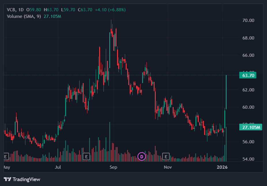 Với cổ phiếu VCB của Vietcombank, nhịp tăng trần trong phiên đã kéo thị giá cổ phiếu này lên mức 63.700 đồng/đơn vị, cao nhất trong hơn 2 tháng trở lại đây. Đà tăng mạnh này không chỉ mang ý nghĩa về mặt thị giá, mà còn giúp VCB chính thức thoát khỏi xu hướng giảm kéo dài từ tháng 8 năm ngoái, qua đó cải thiện đáng kể tín hiệu kỹ thuật của cổ phiếu đầu ngành ngân hàng.