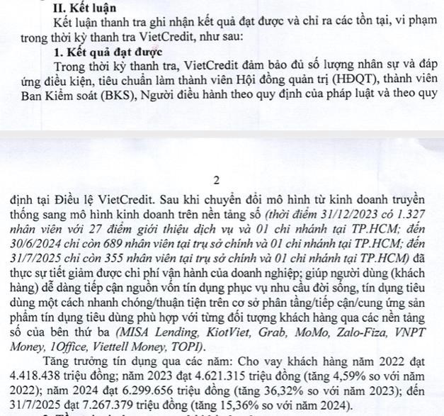 Tuy nhiên, kết luận thanh tra chỉ rõ, bên cạnh những kết quả đạt được, VietCredit vẫn còn tồn tại nhiều hạn chế, vi phạm trong kỳ thanh tra.