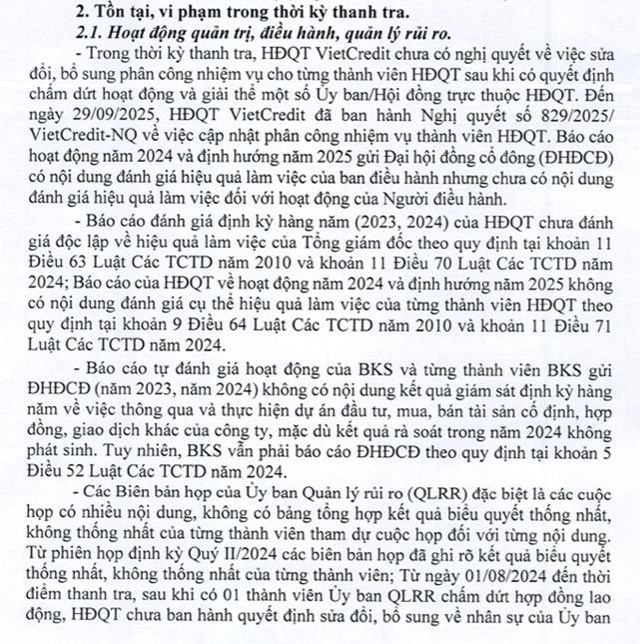Về quản trị, điều hành và quản lý rủi ro: HĐQT VietCredit chưa ban hành Nghị quyết sửa đổi, bổ sung phân công nhiệm vụ cho từng thành viên sau khi có quyết định chấm dứt hoạt động, giải thể một số Ủy ban/Hội đồng trực thuộc HĐQT. Đến ngày 29/9/2025, HĐQT mới ban hành Nghị quyết số 829/2025/VietCredit-NQ để cập nhật phân công nhiệm vụ.