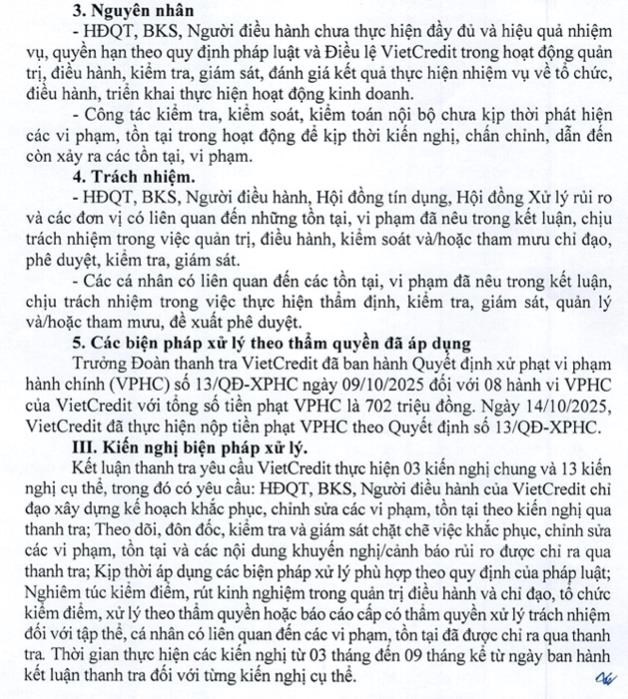 Bên cạnh việc xử phạt, cơ quan thanh tra yêu cầu VietCredit thực hiện 3 kiến nghị chung và 13 kiến nghị cụ thể. Trong đó nhấn mạnh yêu cầu HĐQT, Ban kiểm soát và người điều hành xây dựng kế hoạch khắc phục, chỉnh sửa các vi phạm và tồn tại theo kiến nghị của đoàn thanh tra; đồng thời theo dõi, đôn đốc, kiểm tra và giám sát chặt chẽ tiến độ khắc phục, áp dụng các biện pháp xử lý phù hợp theo quy định.