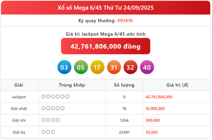 Theo dõi kết quả xổ số Vietlott Mega 6/45 hôm nay 1/10/2025 nhanh chóng và chính xác nhất trên VTC News để không bỏ lỡ thời gian nhận thưởng.
