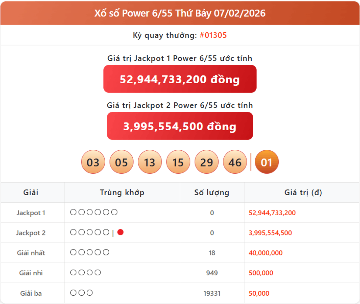 - Bên cạnh hai giải Jackpot, Power 6/55 còn có nhiều hạng thưởng khác, gồm 40 triệu đồng cho vé trúng 5 số, 500.000 đồng cho vé trúng 4 số và 50.000 đồng cho vé trúng 3 số.