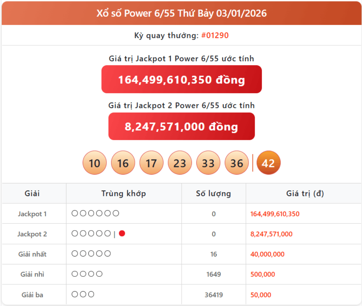 - Bên cạnh hai giải Jackpot, Power 6/55 còn có các giải phụ: 40 triệu đồng cho vé trúng 5 số, 500.000 đồng cho 4 số và 50.000 đồng cho 3 số.