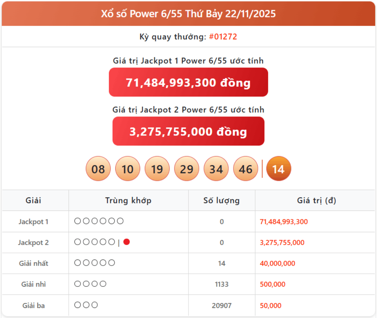 Vietlott 22/11, kết quả xổ số Power 6/55 hôm nay 22/11/2025