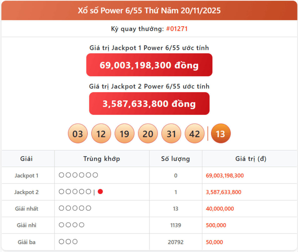Vietlott 20/11, kết quả xổ số Power 6/55 hôm nay 20/11/2025