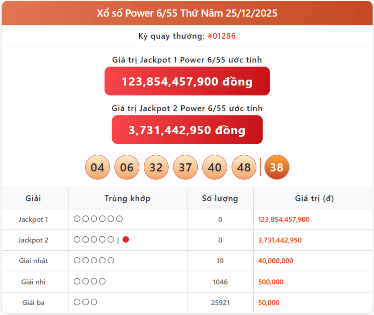 Vietlott 25/12, kết quả xổ số Power 6/55 hôm nay 25/12/2025