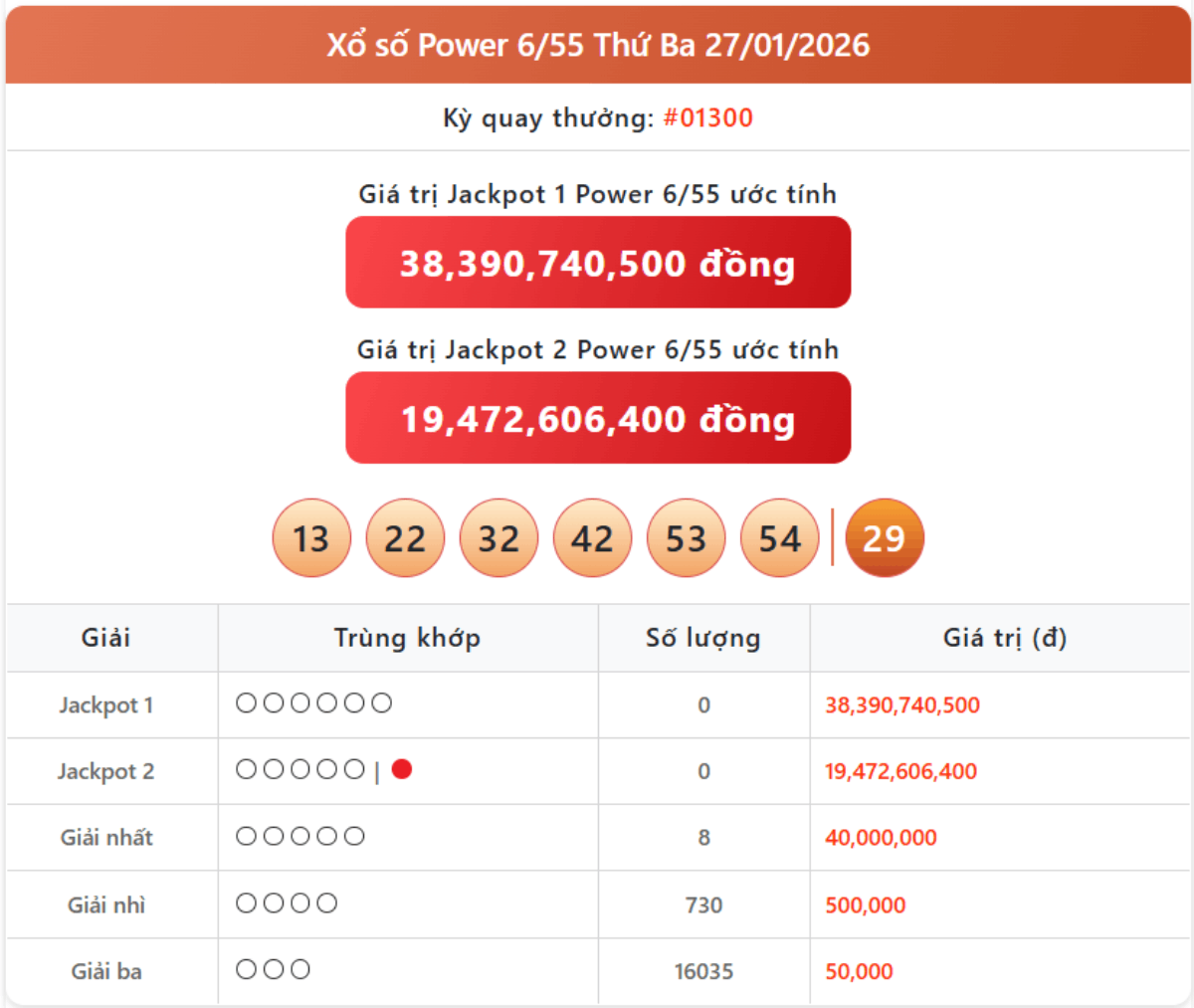 Vietlott 27/1, kết quả xổ số Power 6/55 hôm nay 27/1/2026