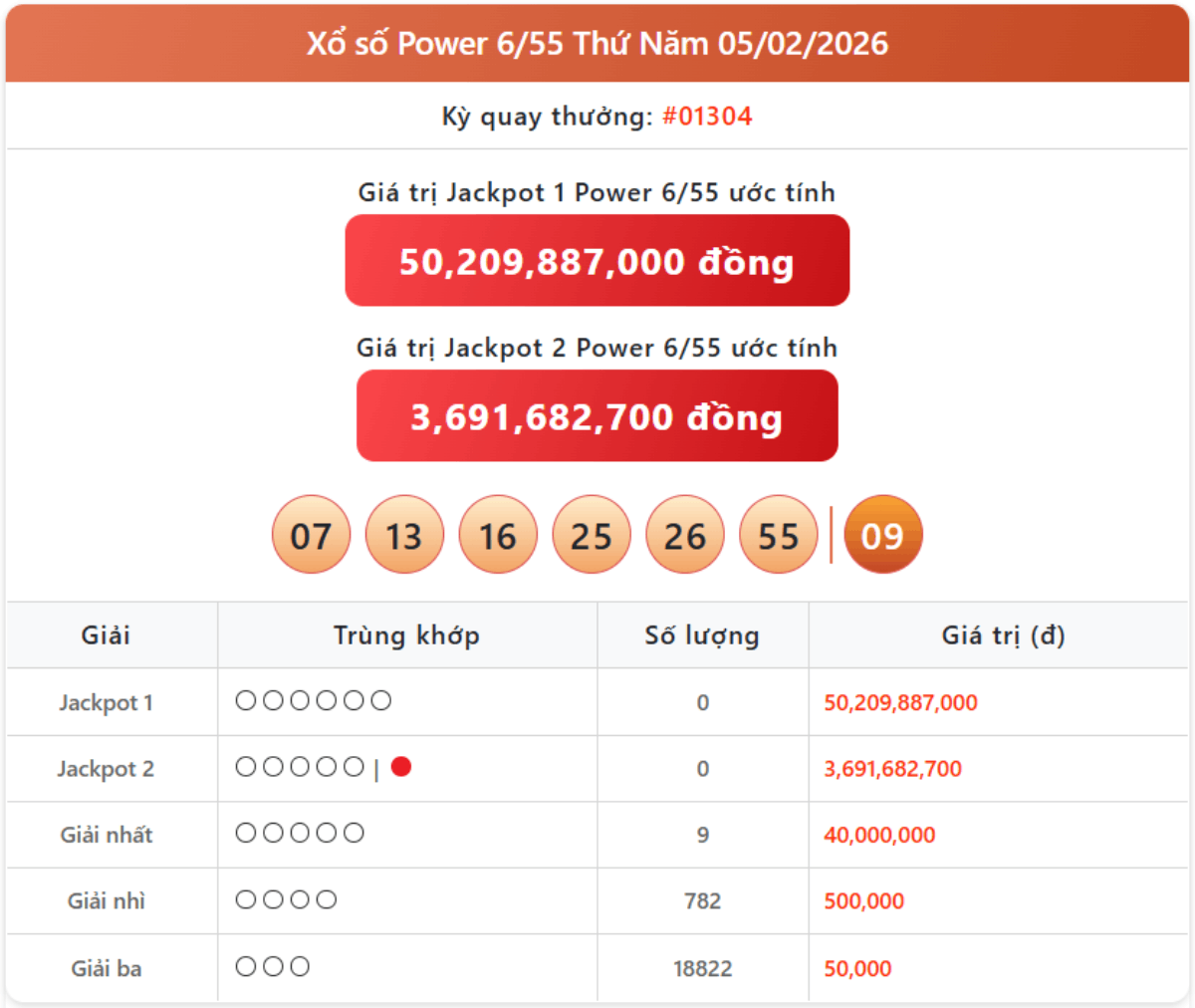 - Vietlott 5/2, kết quả xổ số Power 6/55 hôm nay 5/2/2026