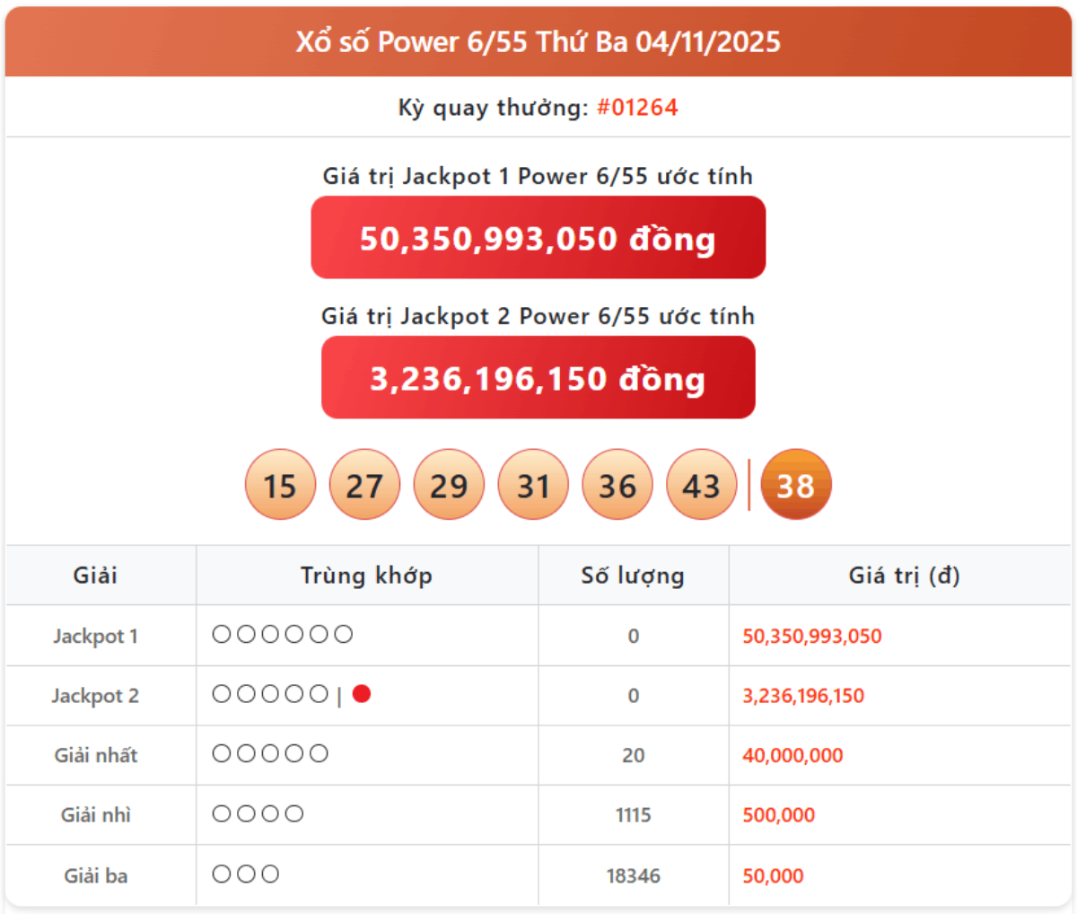 Vietlott 4/11, kết quả xổ số Power 6/55 hôm nay 4/11/2025