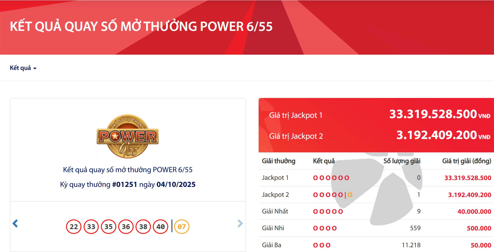 Dãy số may mắn trong kỳ quay thưởng thứ 1.251 của loại hình xổ số Power 6/55 diễn ra vào hôm nay là 22 - 33 - 35 - 36 - 38 - 40 và cặp số vàng để so giải Jackpot 2 là 07.