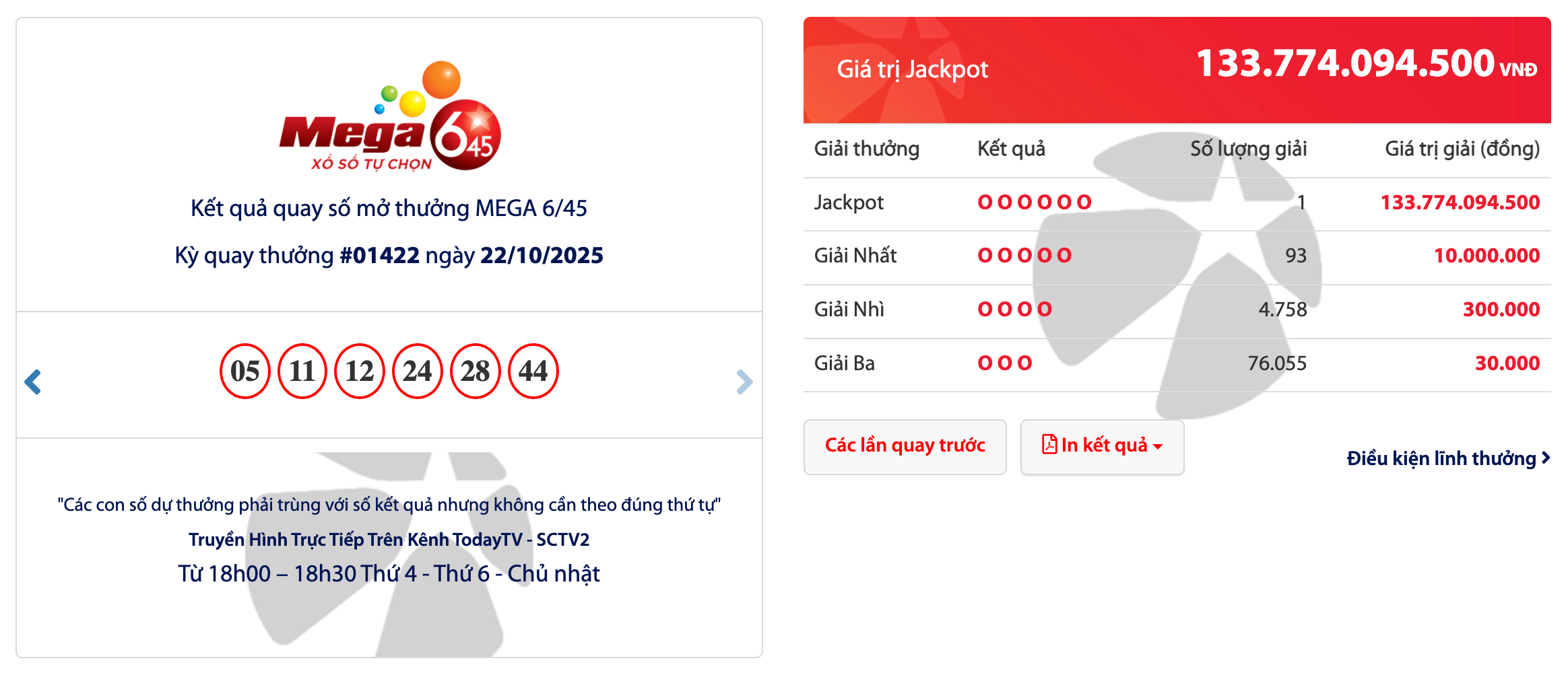 Tối 22/10, Công ty Xổ số điện toán Việt Nam (Vietlott) công bố tại kỳ quay số chiều cùng ngày, 1 vé loại hình vé số Mega 6/45 đã trúng giải Jackpot trị giá hơn 133,7 tỷ đồng.