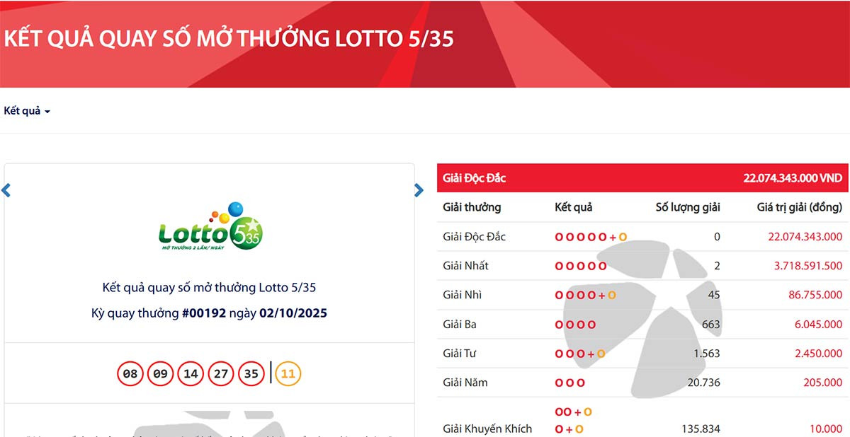 Công ty Xổ số Điện toán Việt Nam (Vietlott) thông tin, trong kỳ quay số mở thưởng lần thứ 192 của loại hình xổ số tự chọn Lotto 5/35 diễn ra vào tối qua (2/10), hội đồng quay thưởng của Vietlott xác định giá trị của giải độc đắc là 22.074.343.000 đồng (hơn 22 tỷ đồng). Song chưa có người chơi nào may mắn trúng giải độc đắc này.