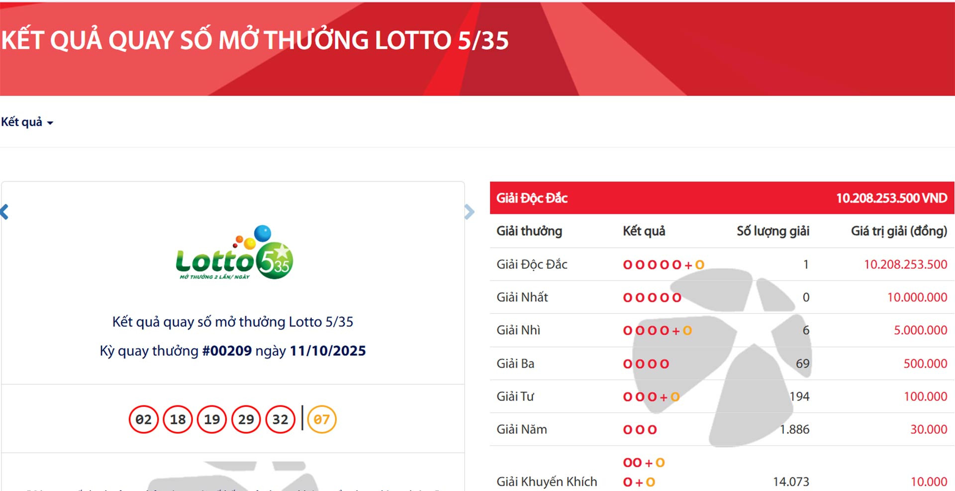 Theo thông tin từ Công ty Xổ số Điện toán Việt Nam (Vietlott), tại kỳ quay số mở thưởng lần thứ 209 của loại hình xổ số tự chọn Lotto 5/35 diễn ra vào trưa nay (11/10), Hội đồng quay thưởng của Vietlott xác định có 1 vé số đã trúng giải độc đắc trị giá 10.208.253.500 đồng (hơn 10,2 tỷ đồng).