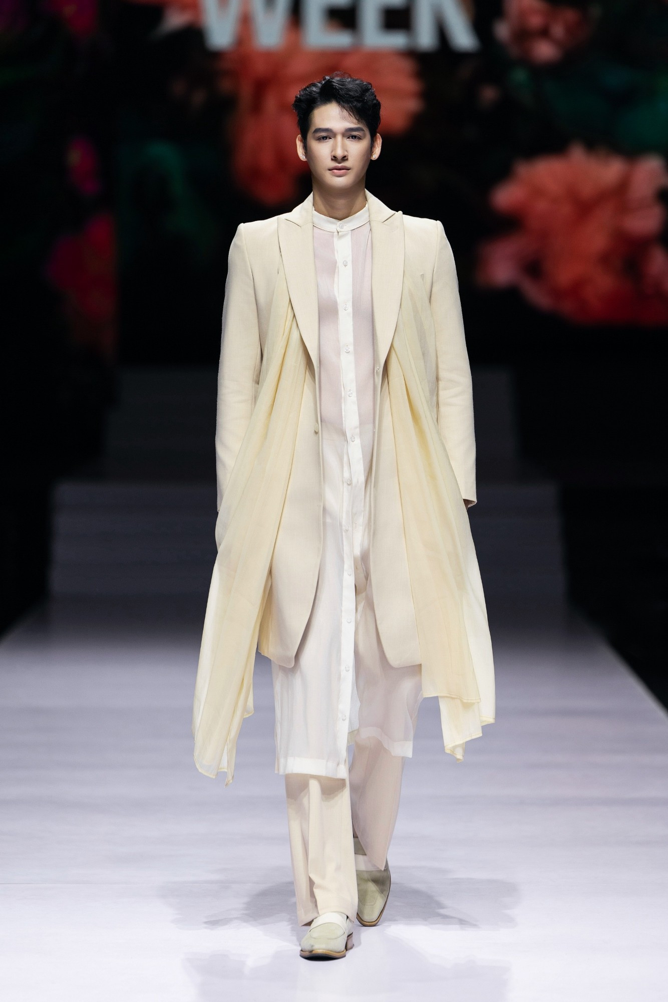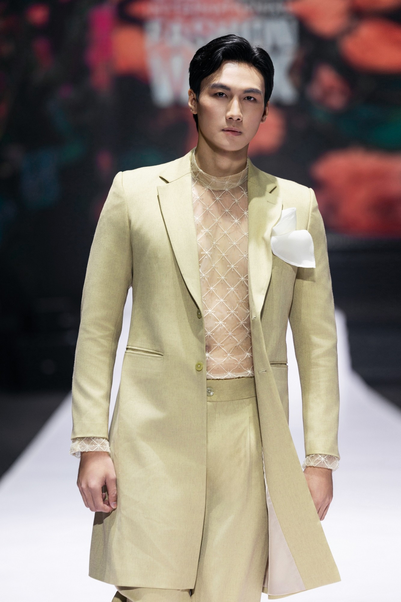 Sàn diễn trở nên cuốn hút hơn với màn xuất hiện của vedette Mạc Trung Kiên trong bộ suit tông be được cách điệu tinh tế, toát lên vẻ mạnh mẽ mà vẫn phảng phất nét mộng mơ, hóa thân thành hình ảnh người đàn ông hiện đại trong thế giới siêu thực “Ethereal Enchantment.”