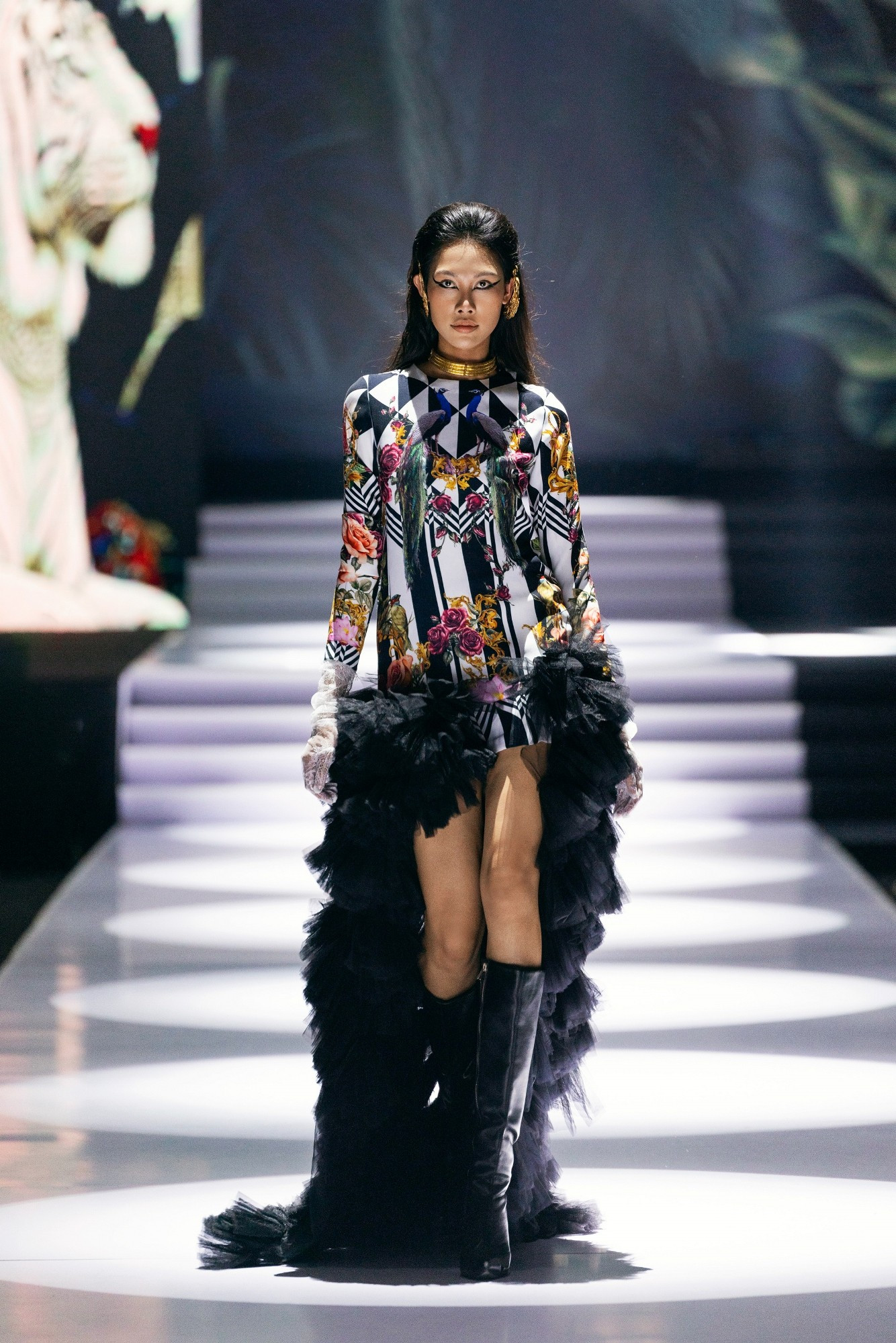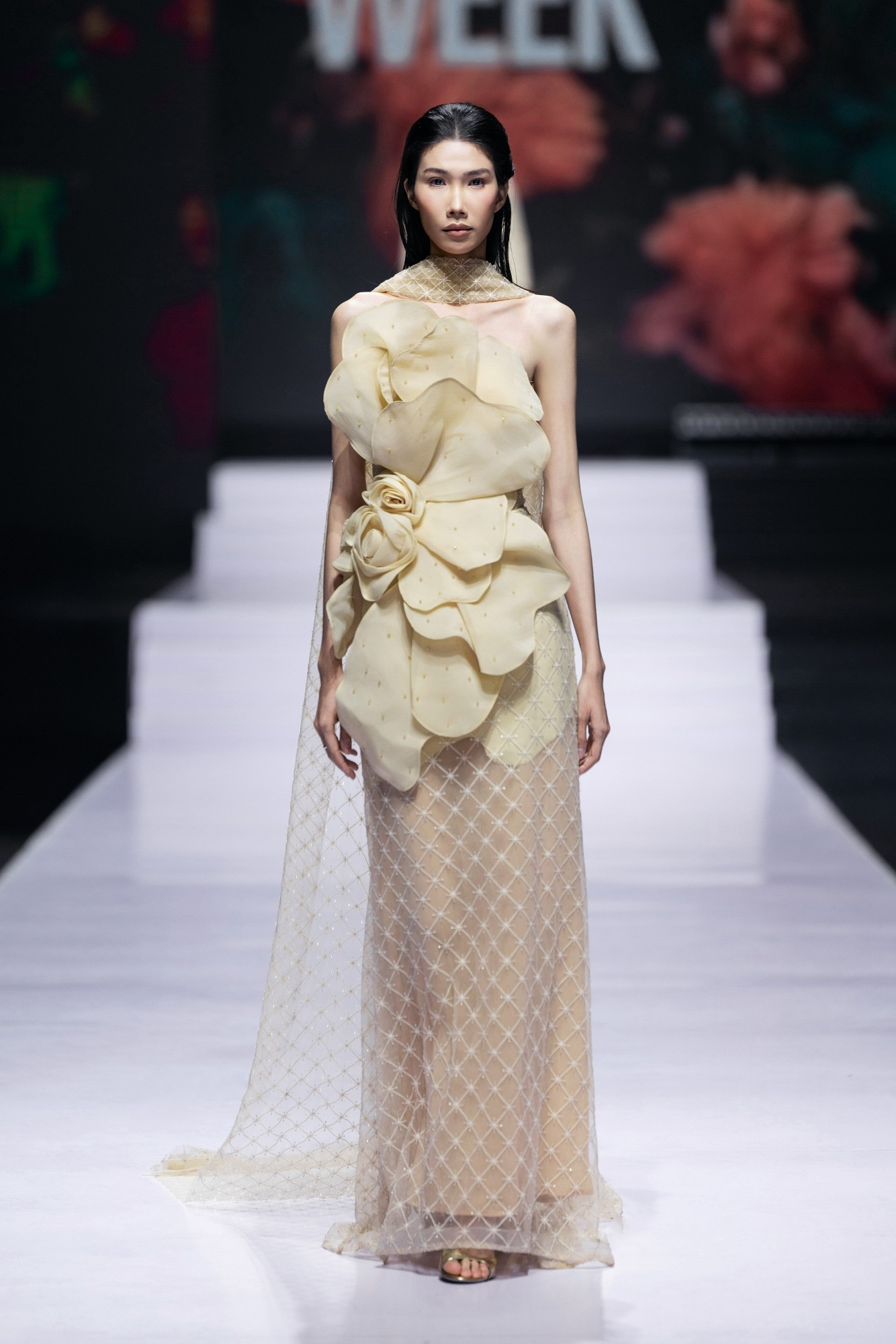 Điểm nhấn của đêm diễn là sự xuất hiện lần đầu tiên của nhà thiết kế đến từ Campuchia Natacha Van, với bộ sưu tập “Ethereal Enchantment”- một thế giới của vẻ đẹp mong manh, siêu thực và mê hoặc, nơi vẻ đẹp mong manh được thăng hoa trong sự giao hòa của ánh sáng, âm nhạc và thời trang.