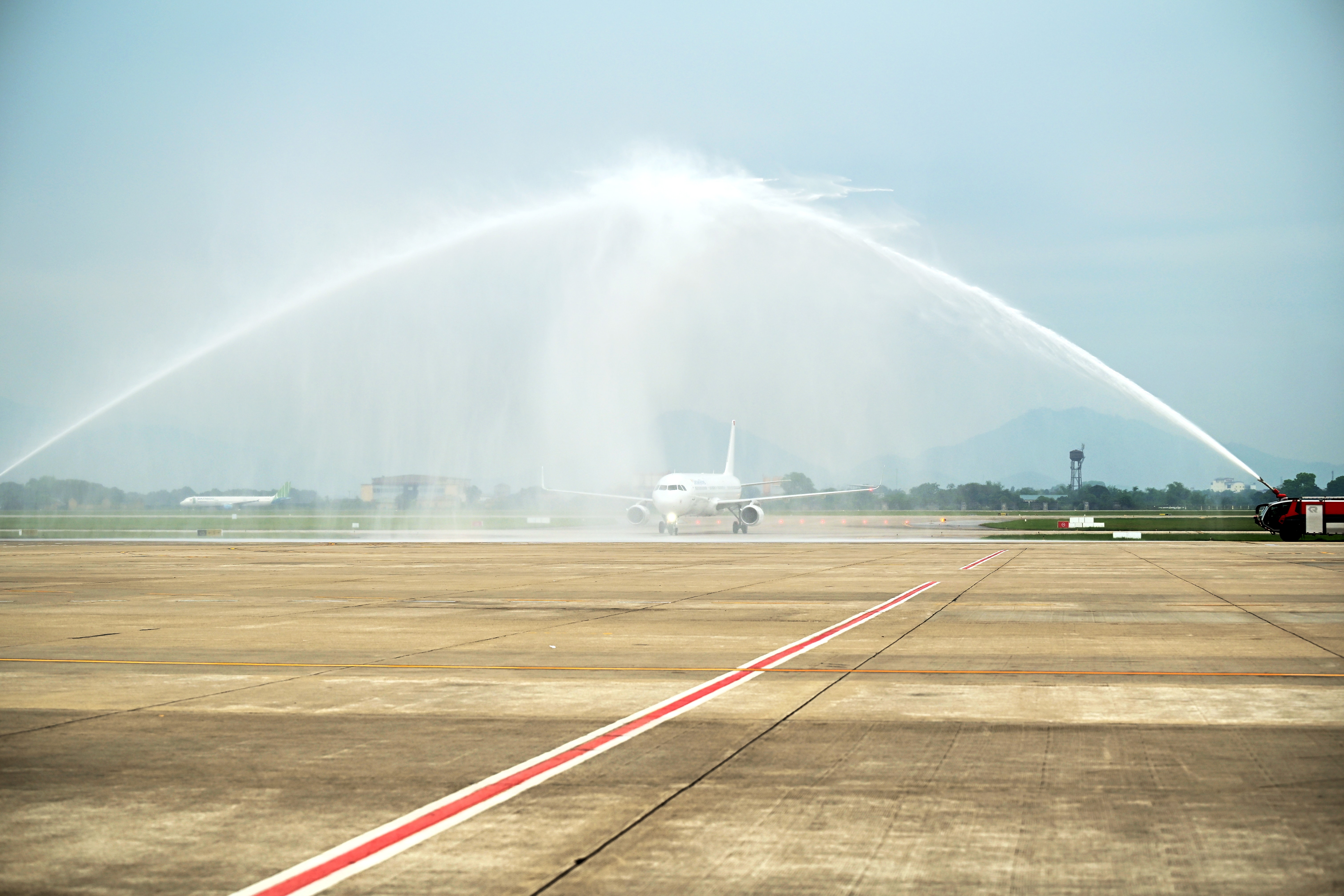 Nghi thức phun vòi rồng chào đón chiếc máy bay Airbus A321 thuộc sở hữu của Vietravel Airlines. Ảnh VT