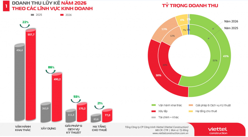 Đại diện Viettel Construction cho biết, các mảng kinh doanh cốt lõi đều ghi nhận mức tăng trưởng doanh thu cao so với cùng kỳ năm 2025. Trong đó, doanh thu mảng xây dựng ghi nhận đà tăng trưởng lên tới 86%, theo sau là mảng giải pháp & dịch vụ kỹ thuật (tăng 53%), mảng vận hành khai thác (tăng 22%) và mảng hạ tầng cho thuê (tăng 21%). So với kế hoạch đề ra, Tổng công ty đã hoàn thành 8% kế hoạch doanh thu lẫn kế hoạch lợi nhuận năm nay.