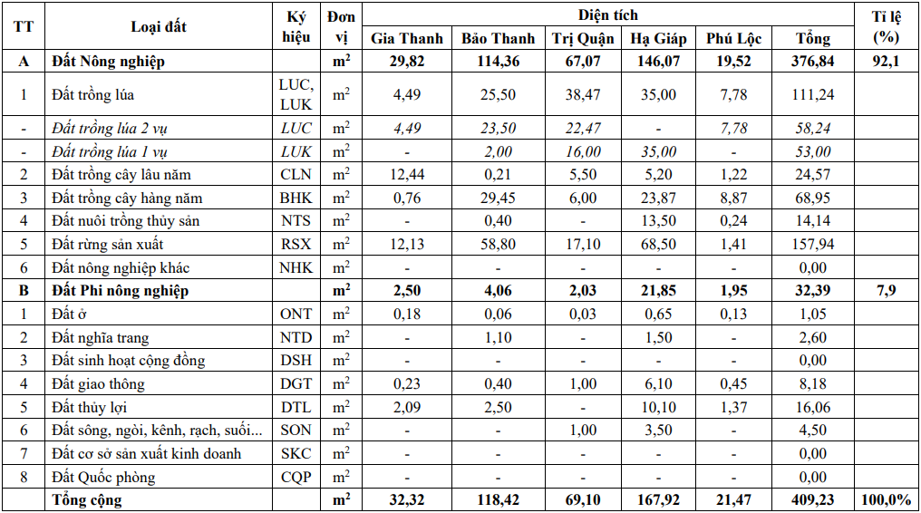 Khu vực thực hiện dự án hiện chủ yếu là đất nông nghiệp, chiếm khoảng 92,10% diện tích, trong đó đáng kể là đất rừng sản xuất với 157,94 ha và đất trồng lúa với 111,24 ha (trong đó đất trồng lúa 2 vụ là 58,24 ha).
