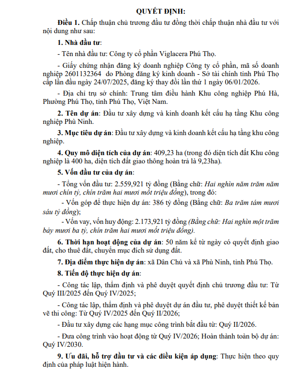 UBND tỉnh Phú Thọ đã ban hành Quyết định số 168/QĐ-UBND ngày 19/01/2026, chấp thuận chủ trương đầu tư đồng thời chấp thuận nhà đầu tư đối với dự án KCN Phù Ninh.